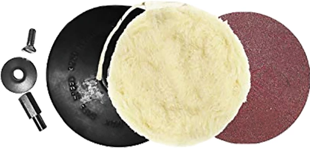 Sanding and buffing kit includes flexible backing pad with arbor polishing bonnet and a medium grit sanding disc