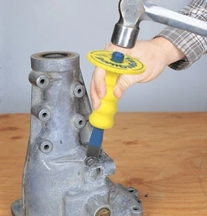 Durable, yellow plastic guard is permanently molded to steel tool to protect against misplaced blows. Comfortable hand-grip helps absorb shock and vibration. Can be used for metal cutting as well as masonry cutting and shaping. Size: 1-1/4 In. x 12 In