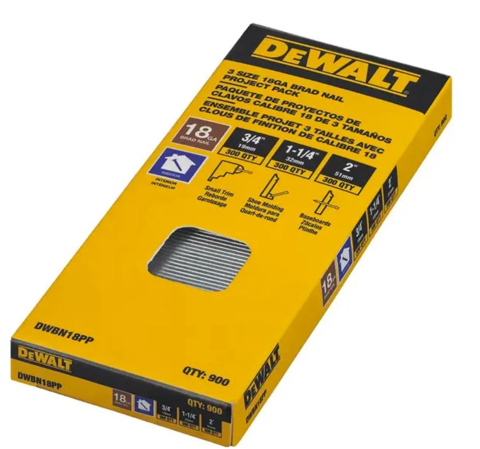 300 of each size in 1 pack. 3/4, 1 1/4 and 2 900 Total 18 Gauge Brads