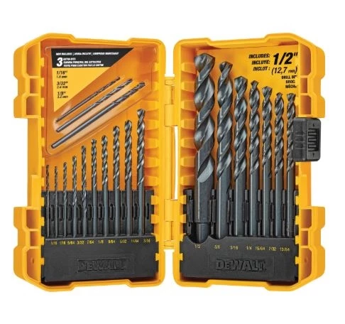 The DEWALT Black & Gold Metal Drill Bits feature a black and gold coating for preventing rust. The tapered web design provides extreme durability to resist breakage. The bits feature a 3-flats shank to reduce spin-out in the chuck. The Black & Gold metal drill bits are made of heavy-duty High Speed Steel for drilling into a variety of materials including plastic, wood, and metal. Each bit features a 135° split point tip design to help reduce walking.