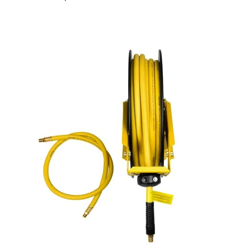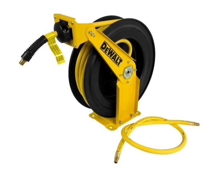 The DeWALT DXCM024-0343 3/8 in. x 50 ft. Double Arm Air Hose Reel is suitable for industrial, contractor, or household use. The spring-powered drive feature makes hose retraction quick, automatic, and easy. The 12 position ratchet gearing lock allows for the hose to be pulled to any length. with the self-leveling system, the hose can be wound up easily. The dual-arm and professional grade all-steel construction of the air hose reel is very strong and reliable. The hose reel uses a 4-roller design to help reduce hose wear. The premium rubber air hose stays flexible to work with, even at 40°F below zero, yet still takes the heat up to 150°F without swelling or bubbling. The hose is kink and oil resistant under pressure and has a 3/8 in. x 4 ft. lead in the air hose for easy compressor connection. The DeWALT 3/8 in. x 50 ft. Double Arm Hose Reel is the perfect accessory for any air tool and any air compressor that operates at 300 PSI or less.