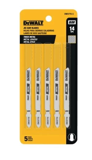 Built for speed and precision, DEWALT T-Shank Metal Cutting Jig Saw Blades feature a unique curved tooth design that minimizes stress points for long blade life and fast cuts. Extra-deep gullets quickly eject chips, and cobalt steel (bi-metal) packs each blade with extreme durability. T-shank design fits all Bosch and DEWALT jig saws.