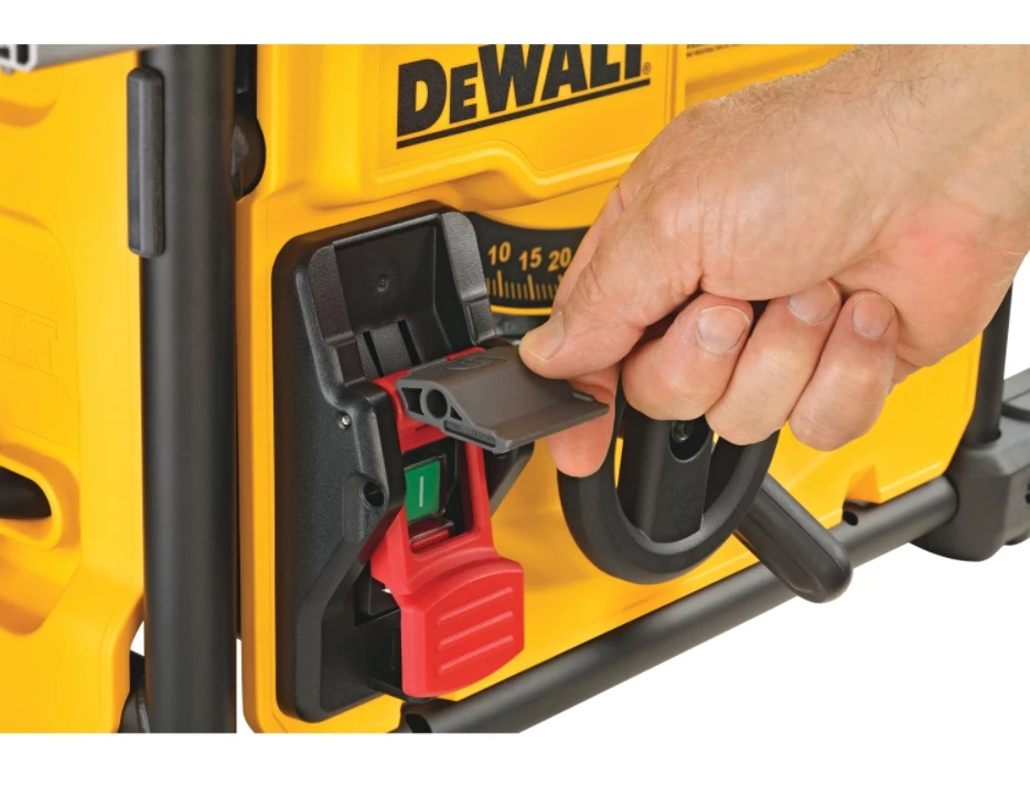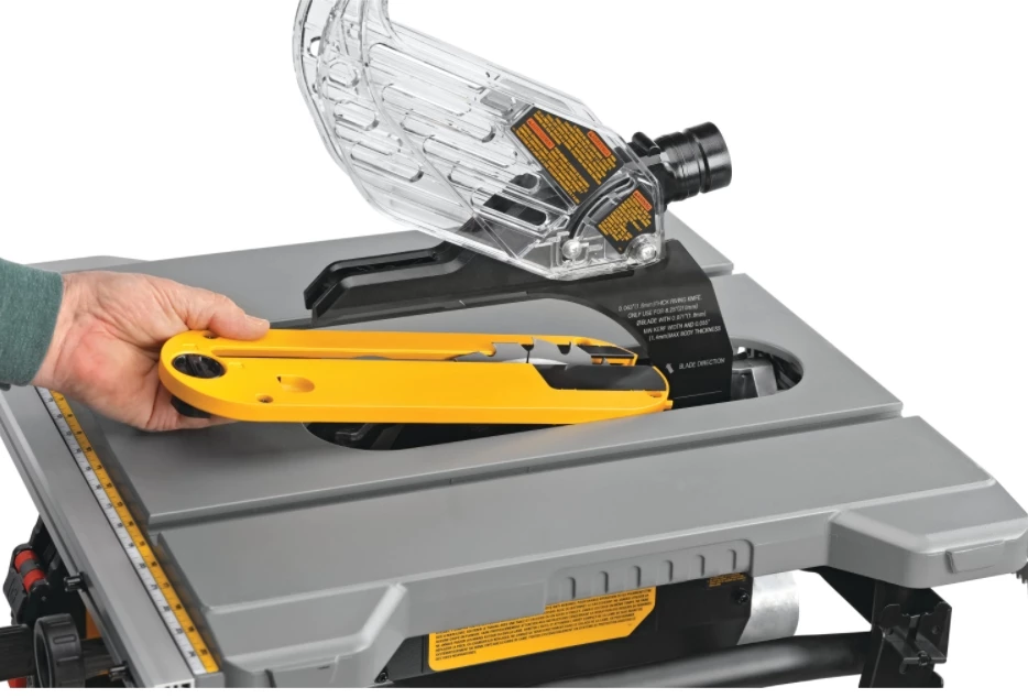 Maximized for accuracy and capacity, this 8-1/4 in. Table Saw includes on-board storage for the blade guard assembly, non-through cut riving knife, anti-kickback pawls, blade-change wrenches, miter gauge, and push stick. The powerful 15 Amp, 5800 rpm motor allows users to complete a majority of applications. The rack & pinion fence allows for fast, easy adjustments and provides the capacity to rip 4×8 sheet goods.