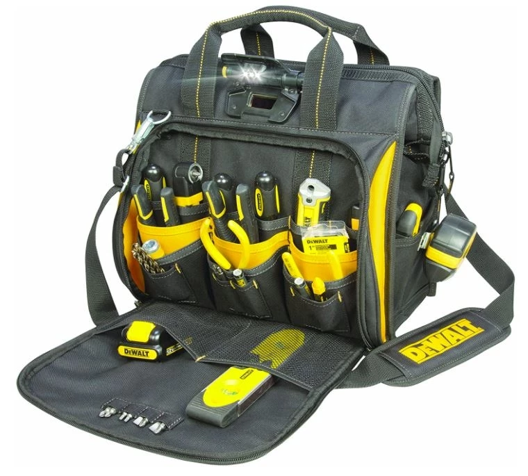The tool bag has 3 Levels of light output allow adjustment for wide area illumination or close-up work with a light output of 39 Lumens max. There are 28 Multi-use pockets inside and 13 outside to help you better organize your tools and the vertical pockets keep tools in sight for quick access. The tool bag has padded web carrying handles and adjustable shoulder straps for comfortable and convenient no-hands transport and a base pad feet to help reduce wear and abrasion. The tool bag holds a multitude of tools and accessories like drills, extension cords, pliers, screwdrivers, wrench sets, drill bits, testers and much more.