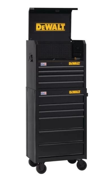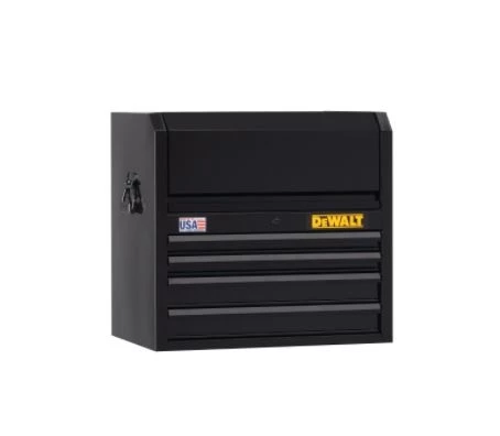 This 26-inch wide 4-Drawer Tool Chest is constructed of double-wall steel for strength and durability. It has four 100-pound load capacity drawers, featuring full-extension ball-bearing drawer slides with soft close latching for smooth and quiet operation. It also has a heavy-duty keyed internal locking system to safeguard tools. Conveniently charge your power tools, batteries, and electronics in the under-lid area which features gas struts for easy opening and closing. Also included are four DEWALT embossed drawer liners and one DEWALT embossed top mat. Recommended with this unit is our 700 Series 26-inch wide 6-Drawer Rolling Tool Cabinet (DWST22760), sold separately. Look no further than our Metal Tool Storage line for your tool storage and organization needs. Choose from a variety of sizes in top tool chests and rolling tool cabinets, all of which are made of 18-20 gauge steel. All units have an 18-inch depth to fit our mechanic tools sets, and other hand tools and accessories.