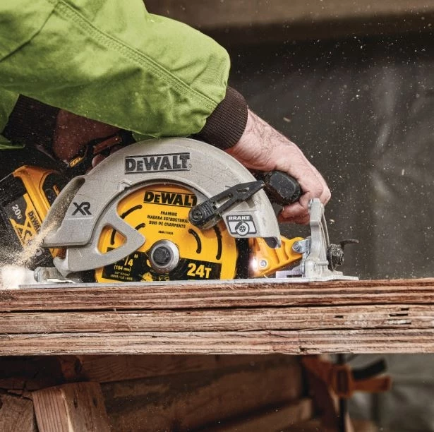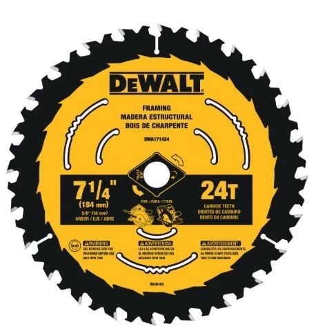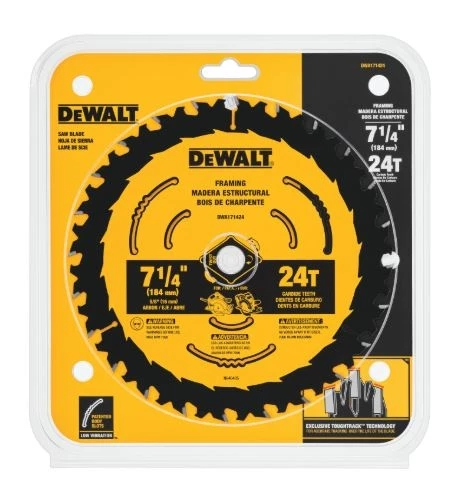 DEWALT Saw Blades are ideal for any wood-cutting application. The exclusive, patent-pending ToughTrackâ„¢ tooth design, on our framing & ripping blades, is engineered to deliver straight, accurate cuts over the life of the blade. Patented Body Slots reduce vibration, which works with the blade’s thin kerf design to deliver exceptional user feel. High-Density Tungsten Carbide teeth are tough, wear-resistant, and provide long life. The reinforced shoulder is designed for strength & durability by providing impact resistance, especially in nail-embedded wood. These blades come with ToughCoatâ„¢ anti-stick coating to reduce friction and gumming. Optimized for use on both corded and cordless circular saws.