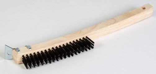 Combines scraping of all types of surfaces with cleaning power for rough areas – the ideal brush for painting jobs. Curved handle with scraper for easy reach. 3 x 19 rows of tempered steel wire, staple-set in plain, sanded hardwood block with hang-up hole.