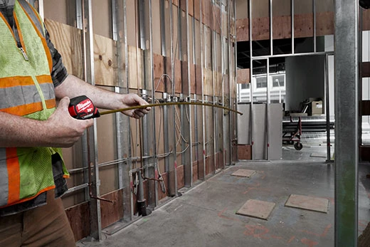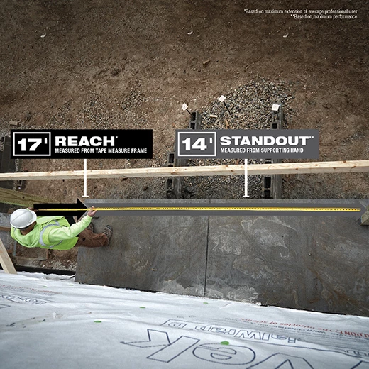 Wide Blade Magnetic Tape Measures have the longest, straightest standout in the industry. The 17’ of reach* allows you to take long measurements on your own and reach further on the jobsite. The blade design delivers the straightest standout*, reducing arc in the blade for efficient and accurate mesasuring. The magnetic hook easily attaches to EMT and steel studs. The tape measures are wear and impact-resistant with nylon bond blade protection and an additional coating on the first 6” of the blade, reducing tape tear. Built to withstand the jobsite, the measuring tapes are constructed with a 5-point reinforced frame for impact resistance.