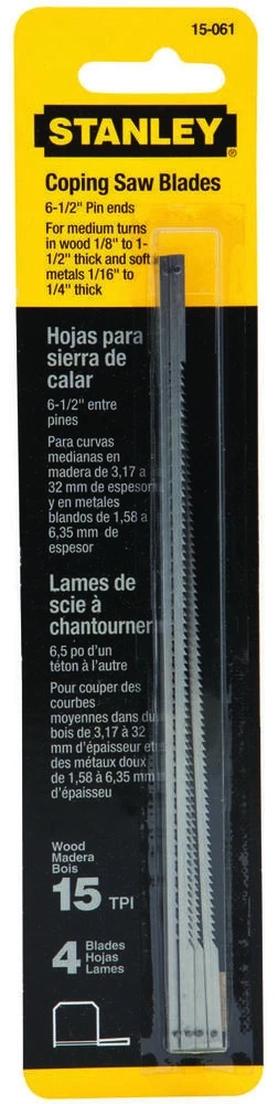 6-1/2″ 15 TPI Coping Saw blades are made with high carbon steel blade-hardened and tempered for longevity and strength.