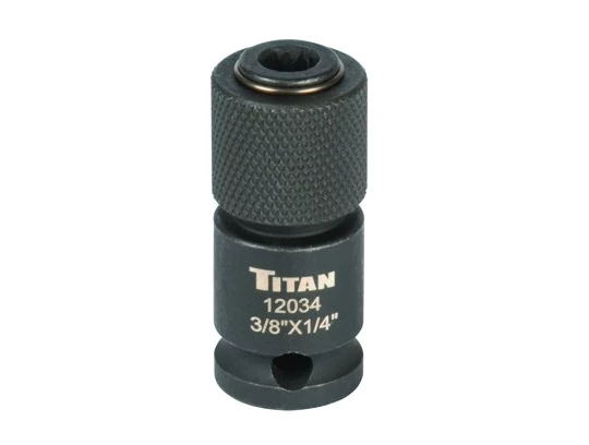 The Titan 12034 3/8” Square Drive to 1/4″ Hex Drive Quick Change Impact Adapter converts 3/8” square drive impact wrench to 1/4″ hex drive. It features a quick-release collar and is constructed of chrome molybdenum steel.